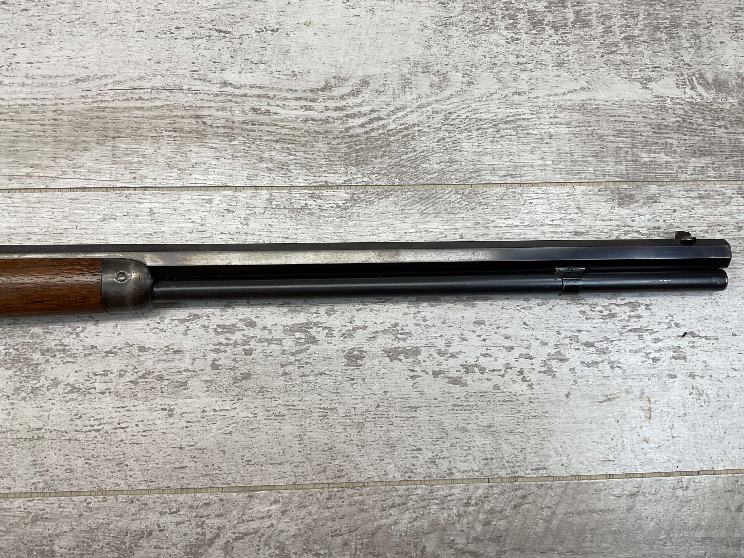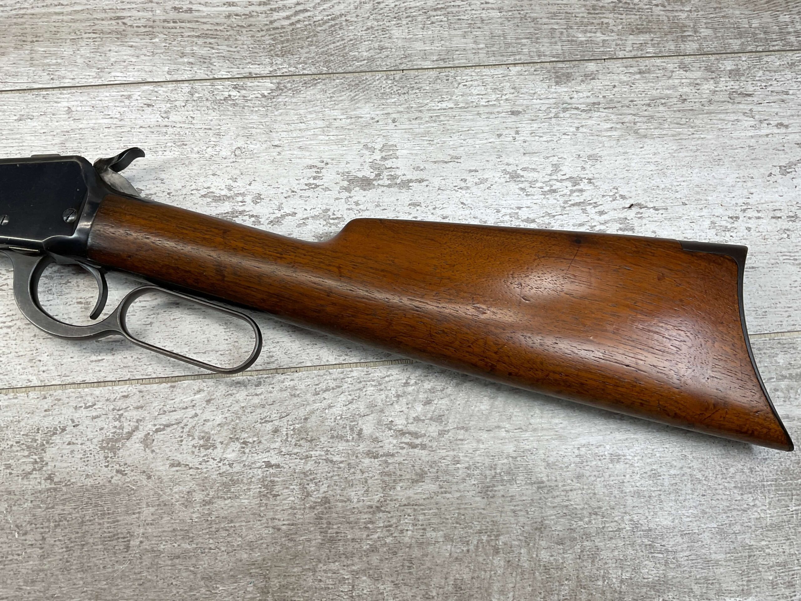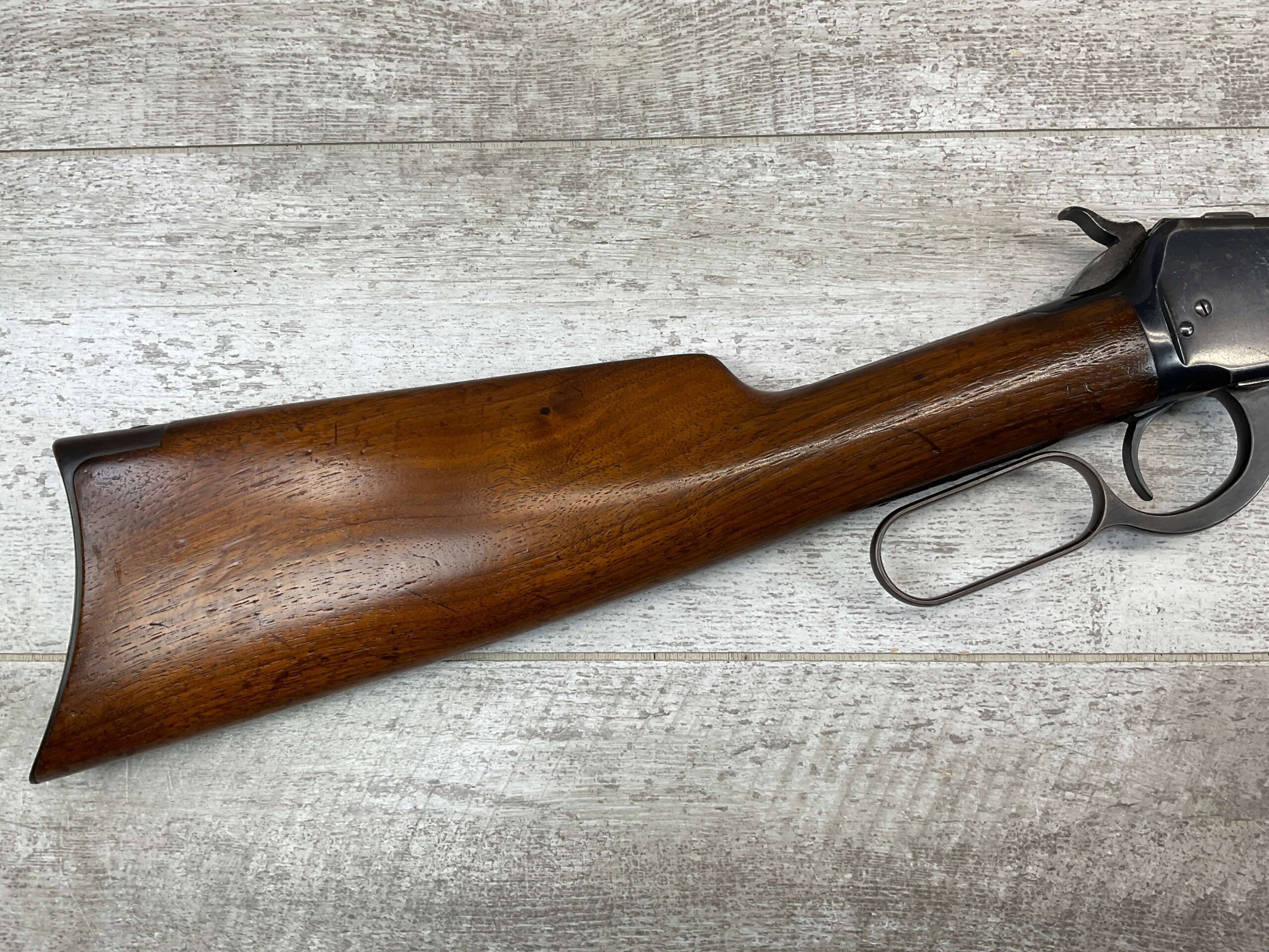 WINCHESTER MODEL 1892 .25-20 WCF LEVER ACTION RIFLE, 1902 MFR #195971, 24″ OCTAGON BARREL, VERY GOOD BORE W/STRONG RIFLING, FULL MAGAZINE, 95+% BLUE REMAINING W/LIGHT PIN PRICKING & LIGHT SCRATCHES FROM AGE, EXC WOOD W/NO CHIPS OR CRACKS, CRESCENT STEEL BUTTPLATE, EXC ACTION, 90+% OVERALL