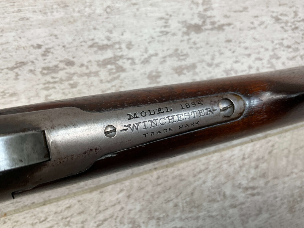 WINCHESTER MODEL 1894 .32-40 LEVER ACTION RIFLE, 1907 MFR #337834, 26″ ROUND BARREL, DARKER POOR BORE W/ GOOD RIFLING, VG WALNUT STOCK W/ CRESCENT BUTT & METAL PLATE, 35% ORIGINAL BLUE FINISH TURNING PATINA W/ VERY LITTLE FINISH REMAINING ON RECEIVER, FULL LENGTH TUBE MAGAZINE, GREAT ACTION & READY TO SHOOT!!