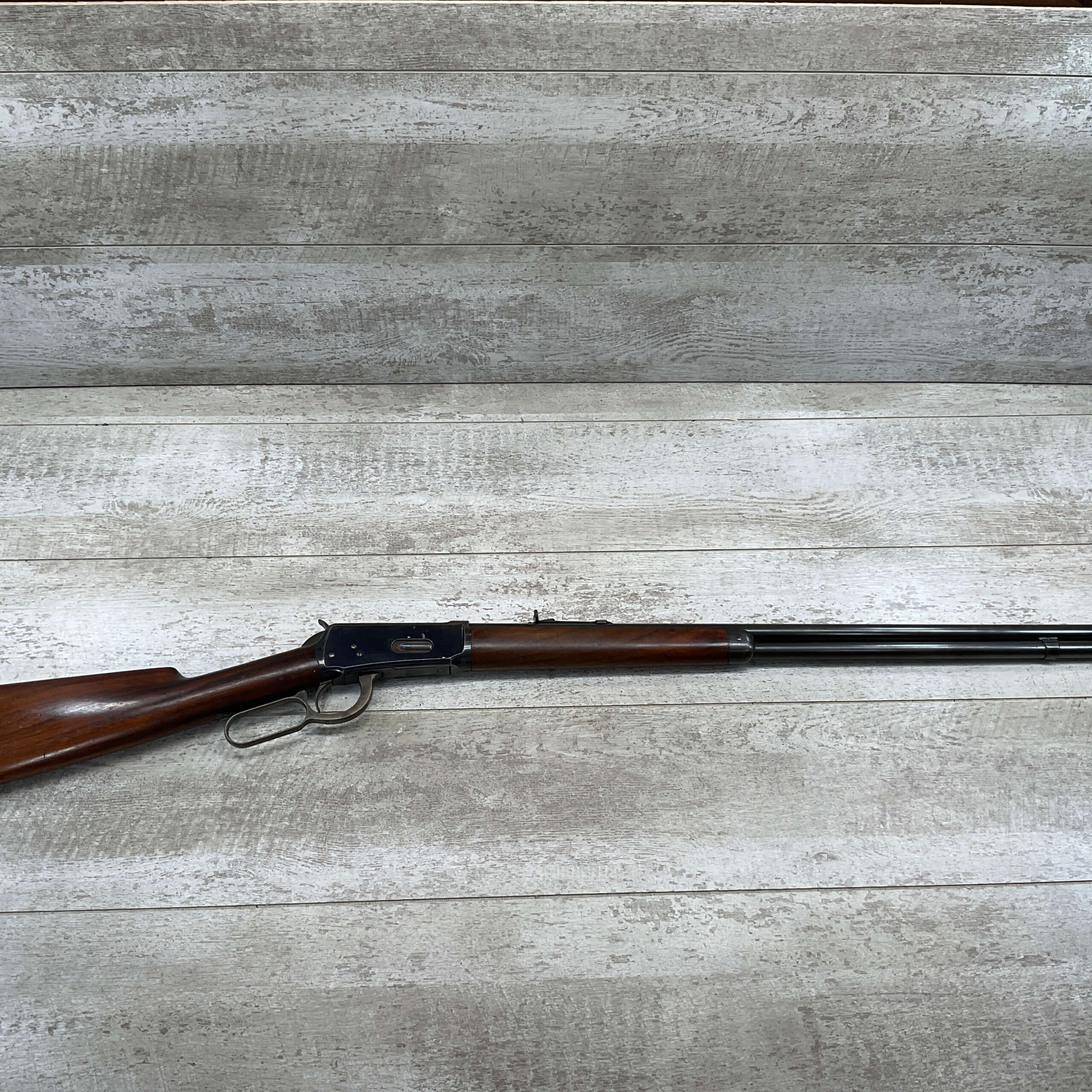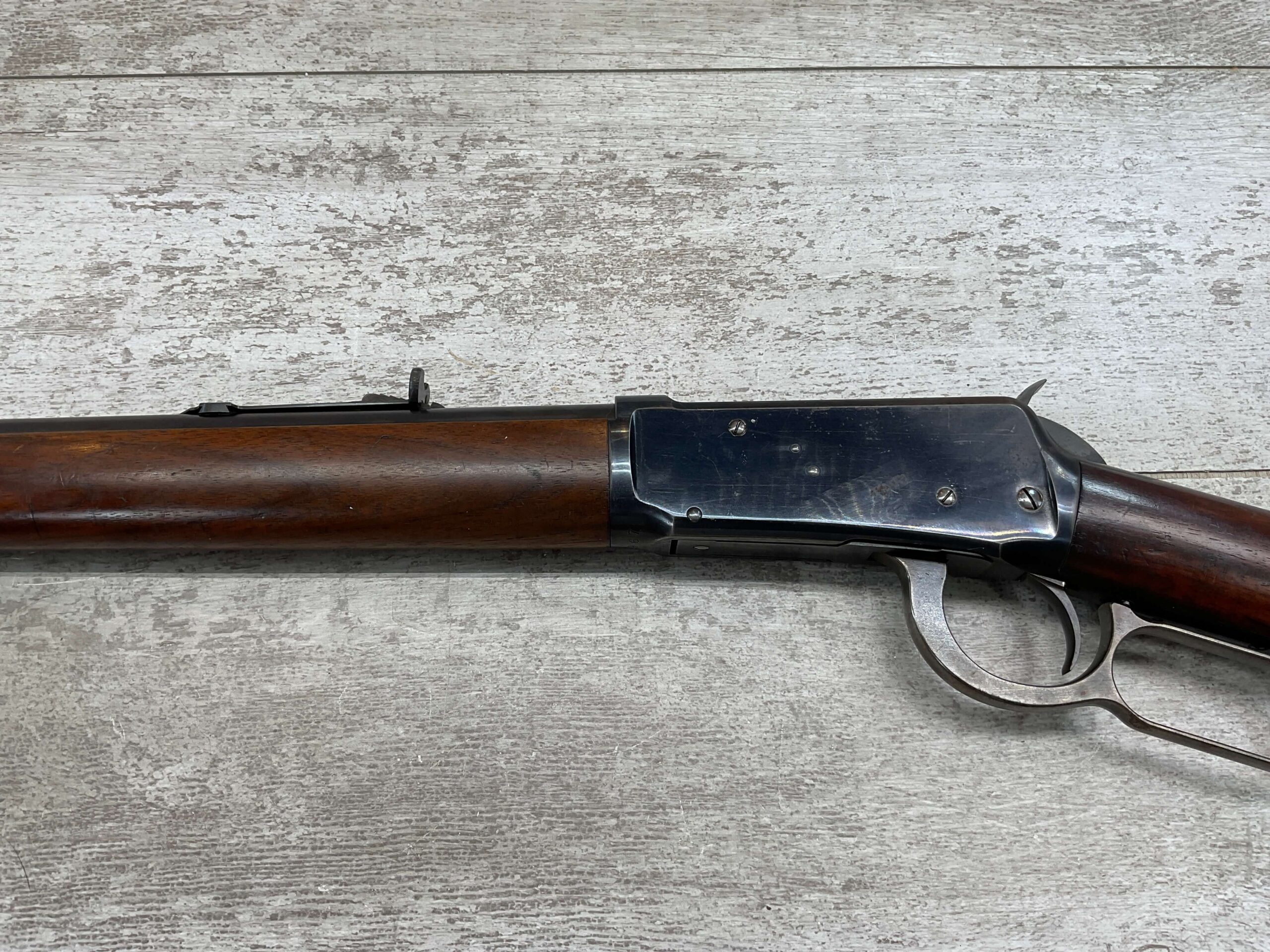 WINCHESTER MODEL 1894 38-55 LEVER ACTION #47967 MFR 1898, 26″ ROUND BARREL BLUE FINISH, LIGHT FADING 80+%, EXC BRIGHT BORE, VERY LIGHT DISCOLORATION ON LEFT SIDE OF RECEIVER, SMALL SCRATCH OVER THE EJECTOR ON RIGHT SIDE OF RECEIVER, HIGH EDGE WEAR FROM USE, FIXED BLADE FRONT SIGHT W/ADJ REAR SIGHT, FURNITURE IS IN VG CONDITION W/LIGHT COMPRESSION MARKS AT THE BASE OF THE STOCK/BUTT PLATE, DISCOLORATION MARKS FROM USE, FULL MAGAZINE, METAL CRESENT BUTT STOCK. VERY GOOD CONDITION HARD TO FIND PIECE OF HISTORY!