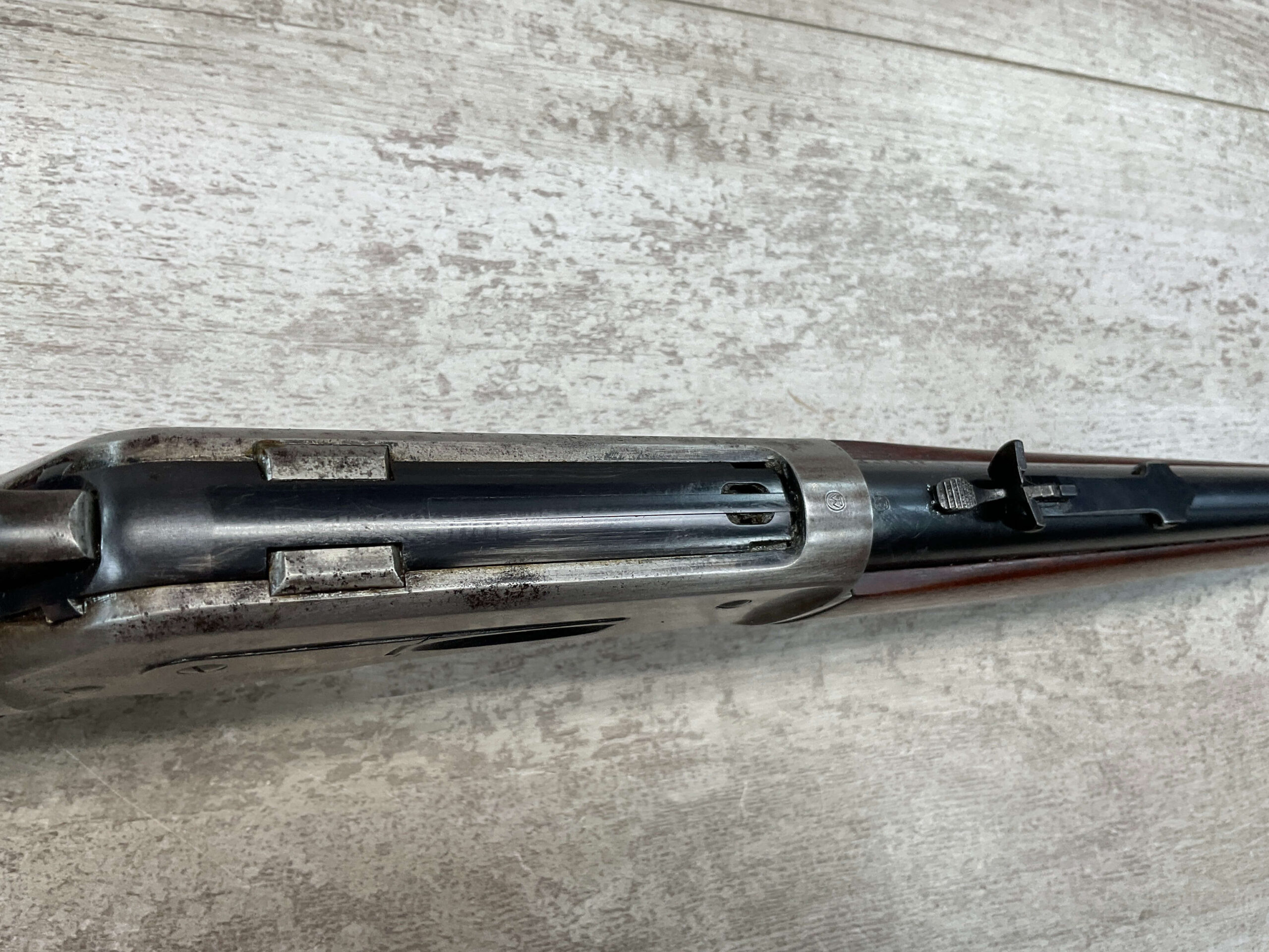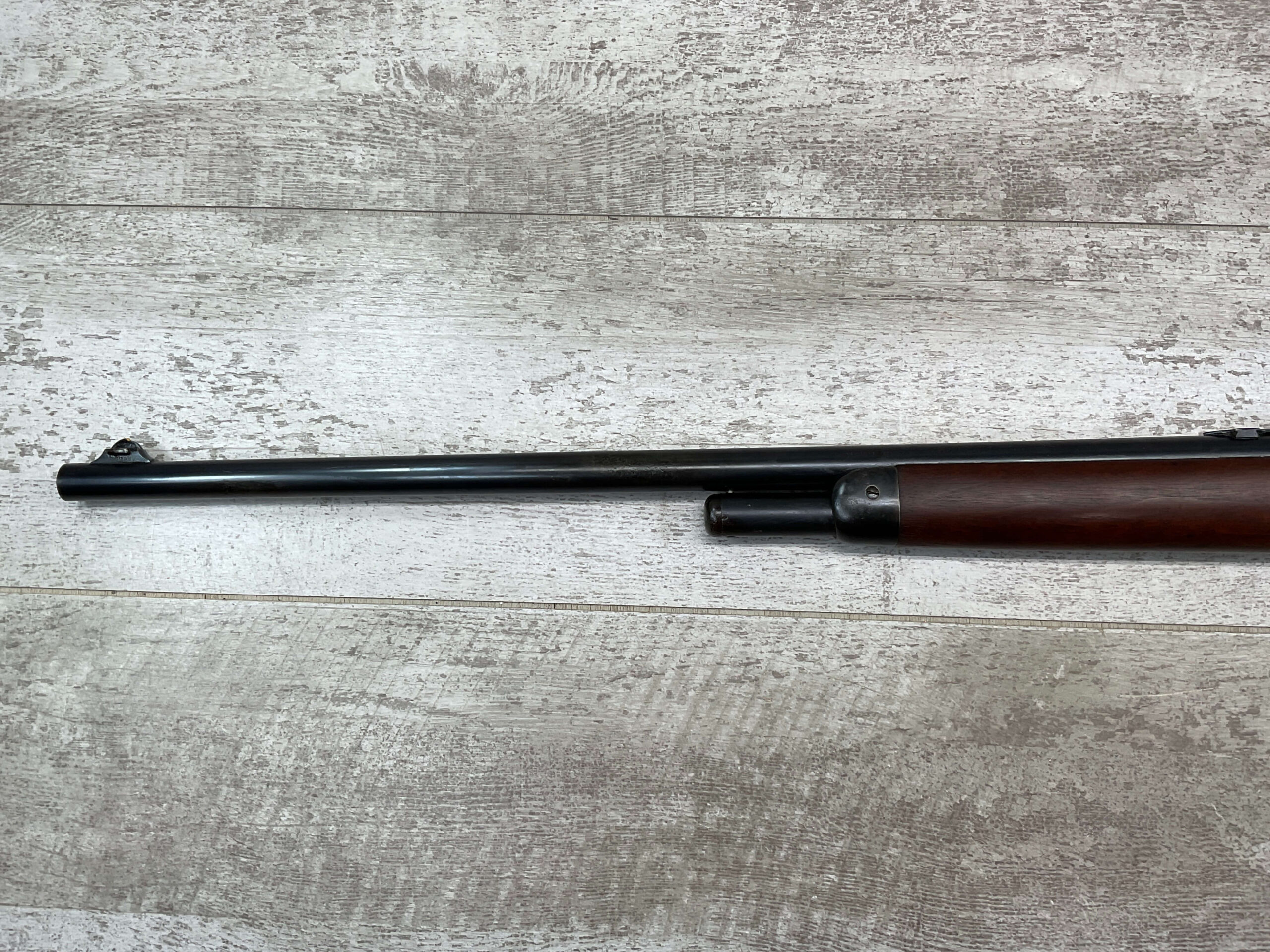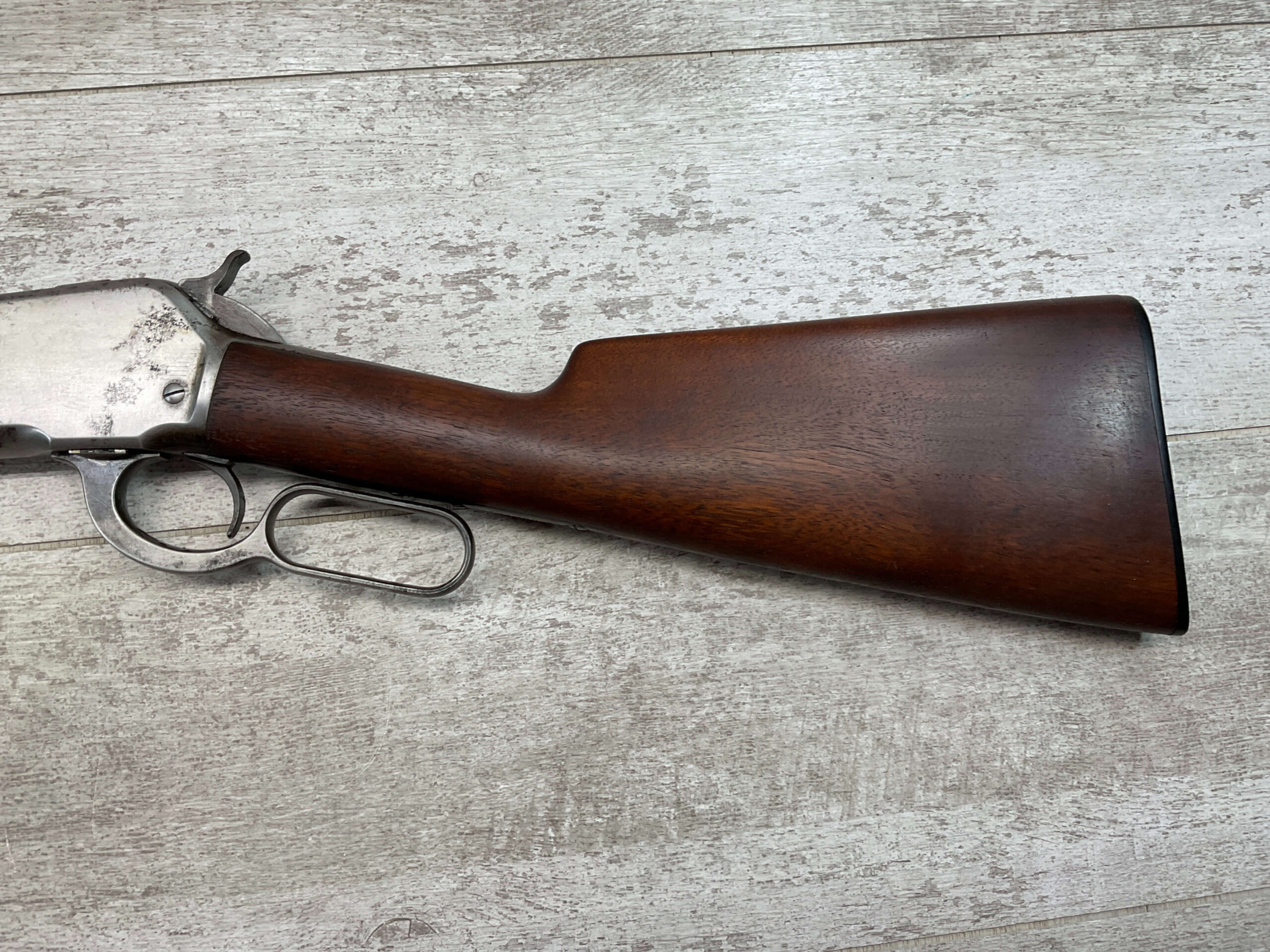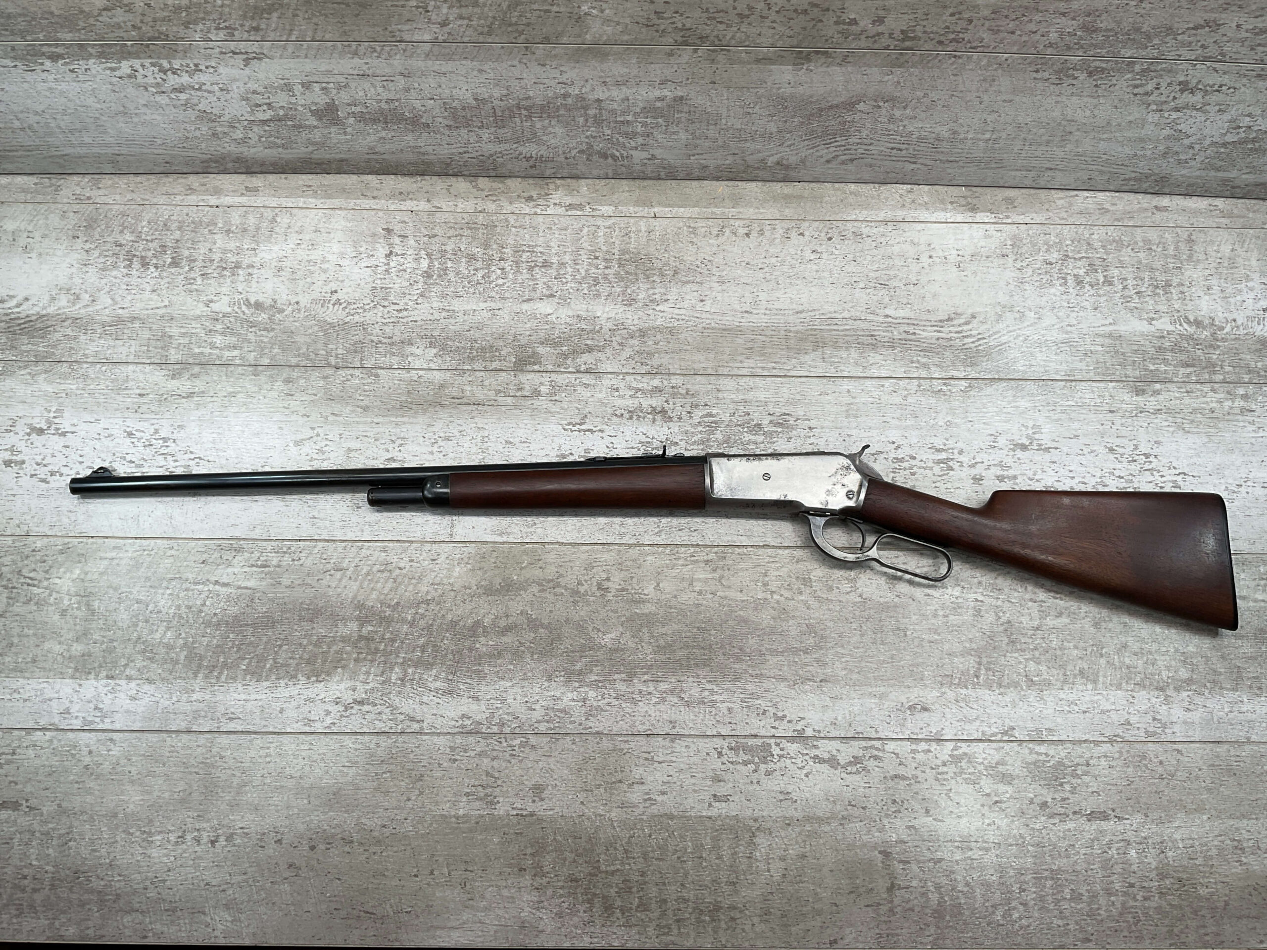 WINCHESTER MODEL 86 .33WCF LEVER ACTION RIFLE, 1911 MFR #151700A, 24″ NICKEL STEEL BARREL, GOOD BORE & RIFLING W/FROSTING IN THE GROOVES, RAISED BLADE FRONT SIGHT, ADJ LADDER REAR SIGHT, EXC WALNUT STOCK, RECEIVER HAS LOST ALL BLUE, BARREL HAS SOME TOUCH UP DONE NEAR FRONT SIGHT AS DID THE END OF THE MAGAZINE TUBE & FRONT CAP, SHOTGUN BUTT PLATE, SMOOTH ACTION