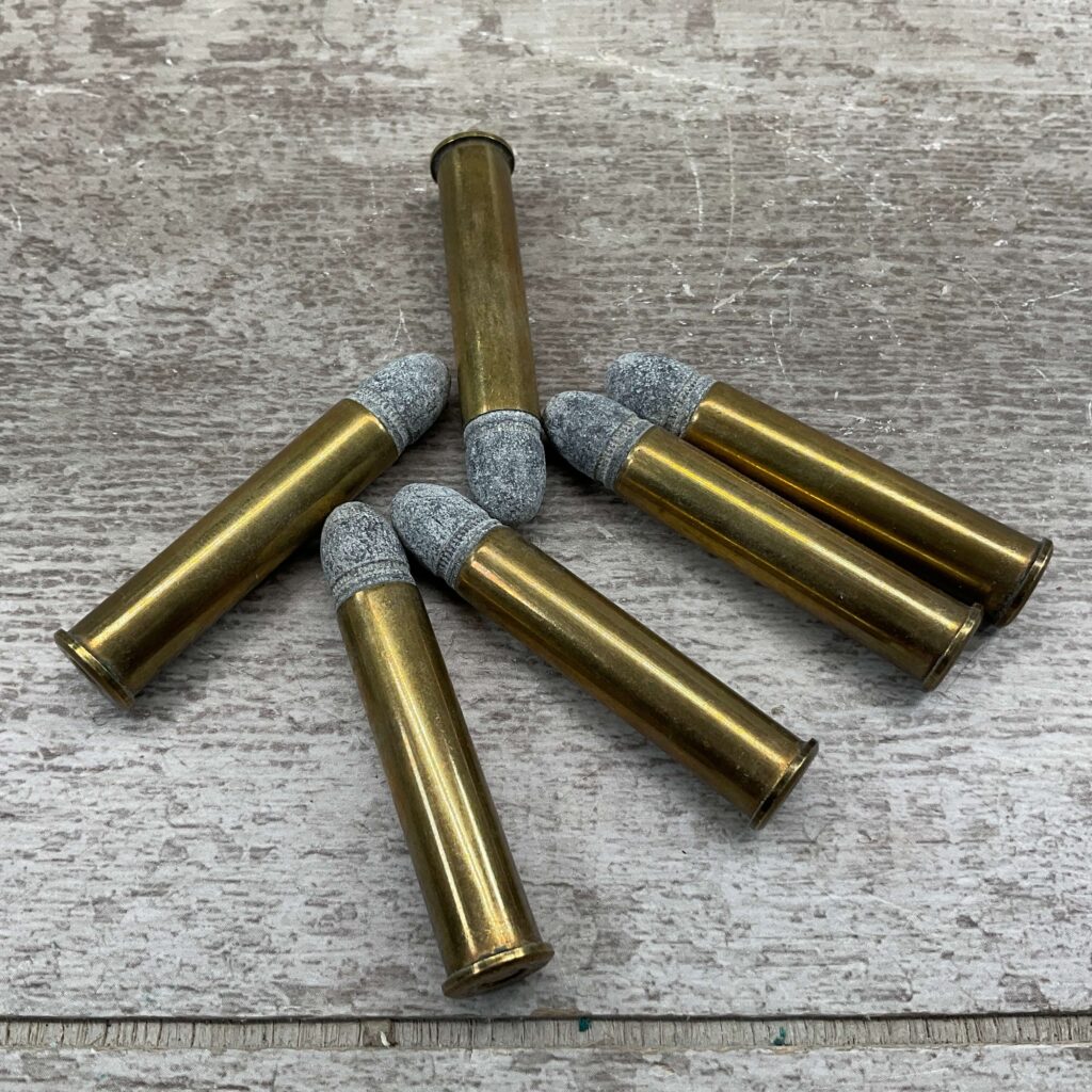 WINCHESTER W.R.A. CO 38 EXTRA LONG CARTRIDGE, FIRST APPEARED IN THE 1875 WINCHESTER CATALOG AND WERE GONE BY 1916, ROUND NOSE BULLET, HEADSTAMP “W.R.A.CO. / .38 EX. L, QTY 6 – VINTAGE