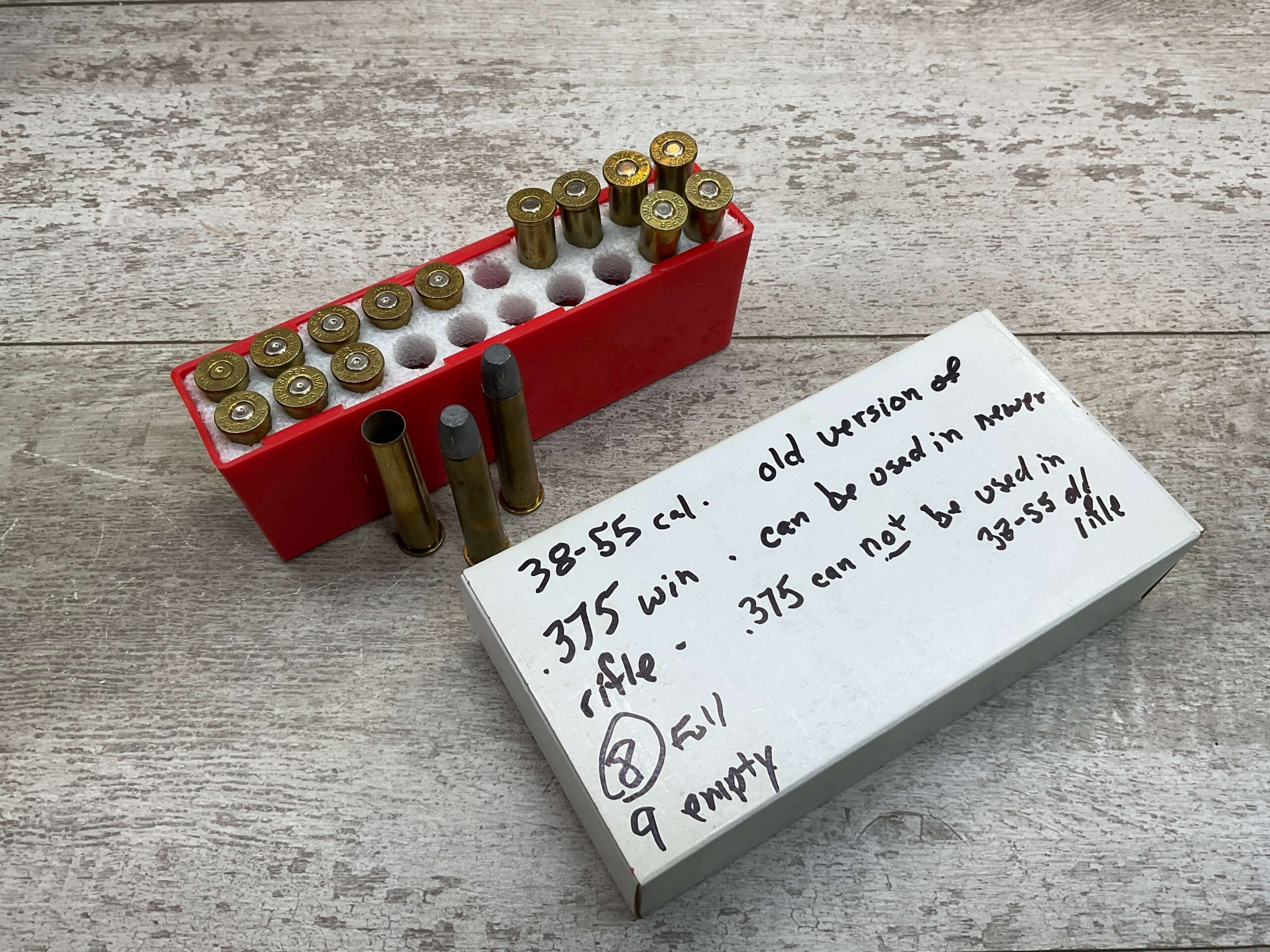 WINCHESTER WESTERN 38-55 CAL. OLD VERSION OF 375 WIN. CAN BE USED IN NEWER RIFLE, CAN NOT BE USED IN 38-55 OLD RIFLE, PARTIAL BOX, 8 LIVE W/ 9 BRASS.