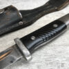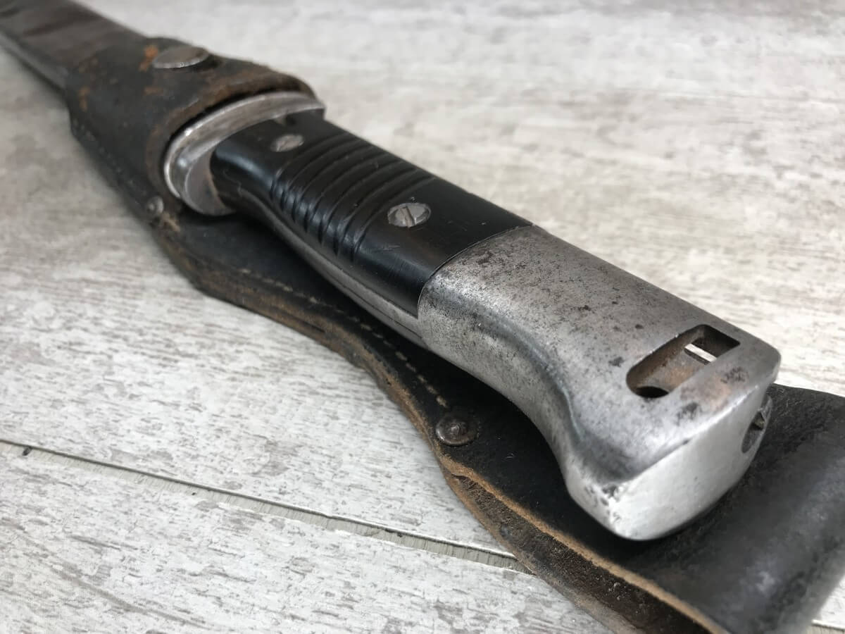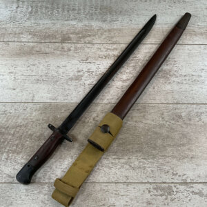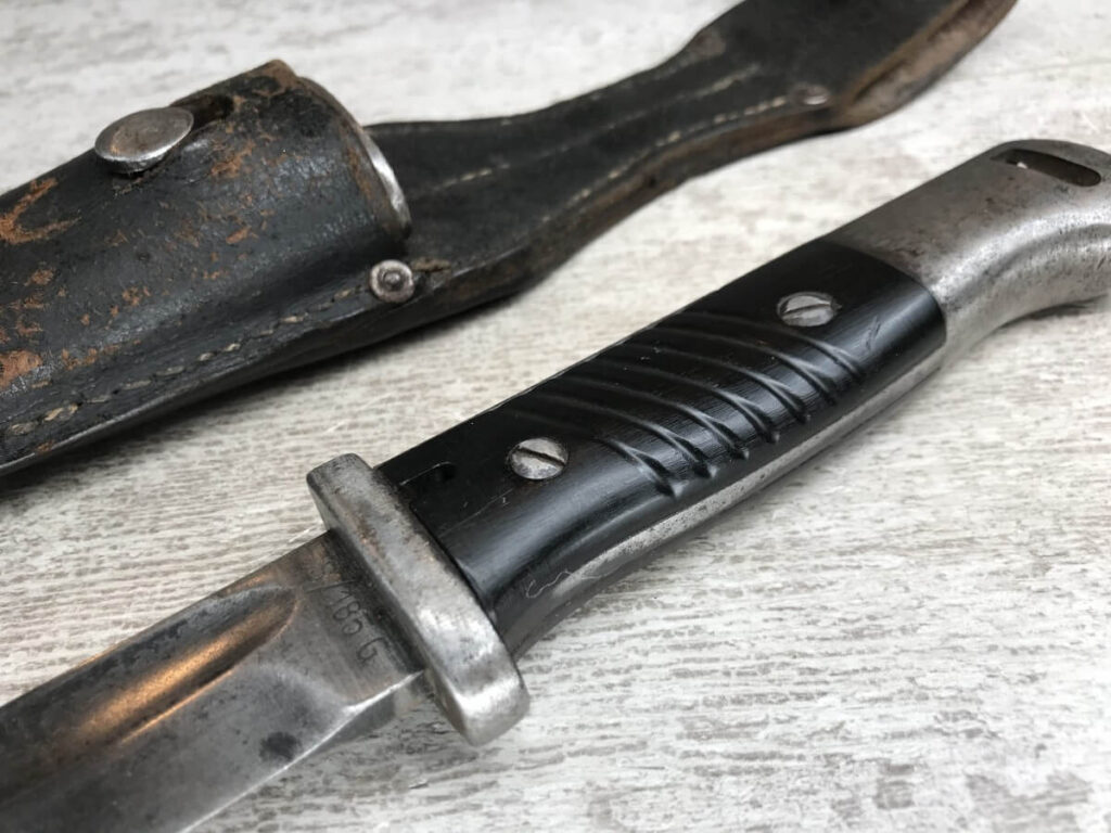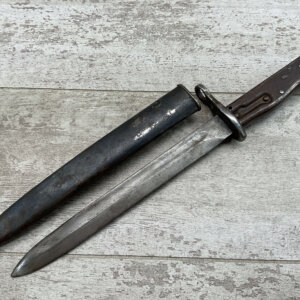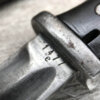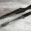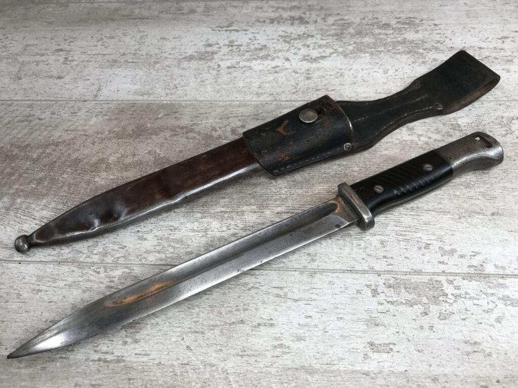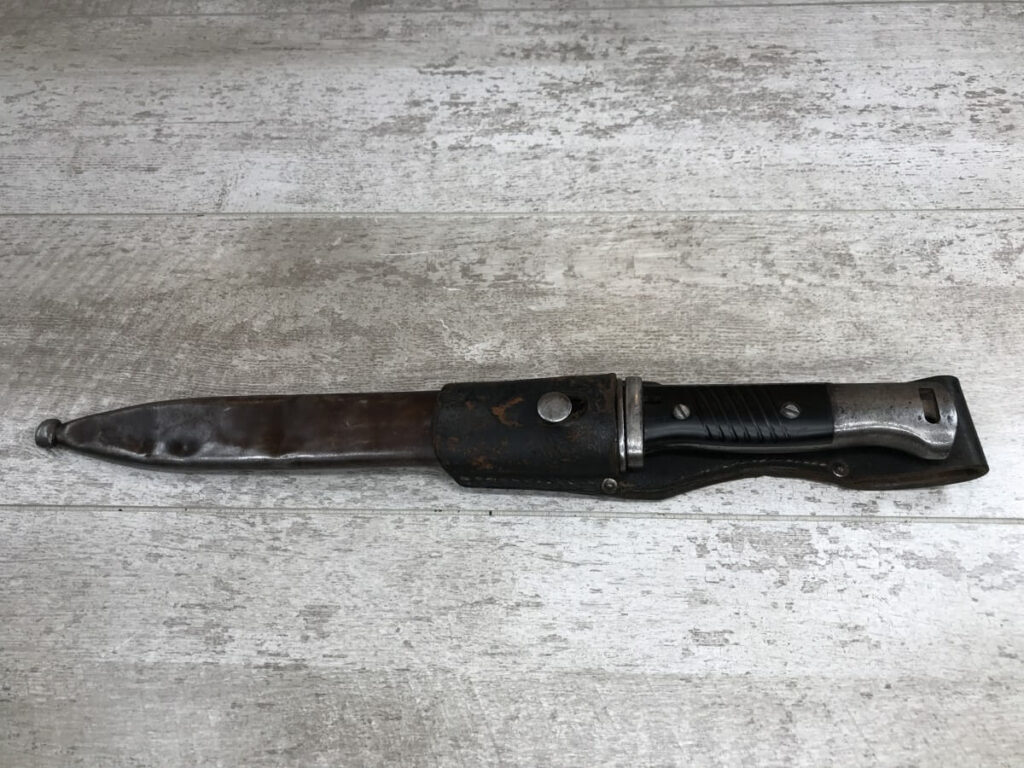 WWII GERMAN K98 BAYONET & METAL SCABBARD/FROG #1477e, 15″ OVERALL, 9 3/4″ BLADE LENGTH, BAKELITE GRIPS, SOME DINGS AND SCRATCHES, WaA218 NEAR PRESS-STUD BUTTON (BUTTON IS MISSING), VG OVERALL CONDITION, SCABBARD IS DENTED BUT BLADE INSERTS SMOOTHLY, SEE PHOTOS