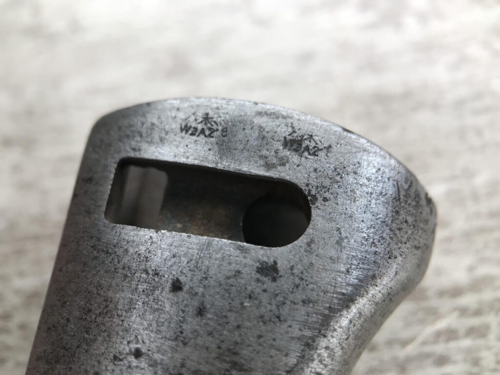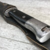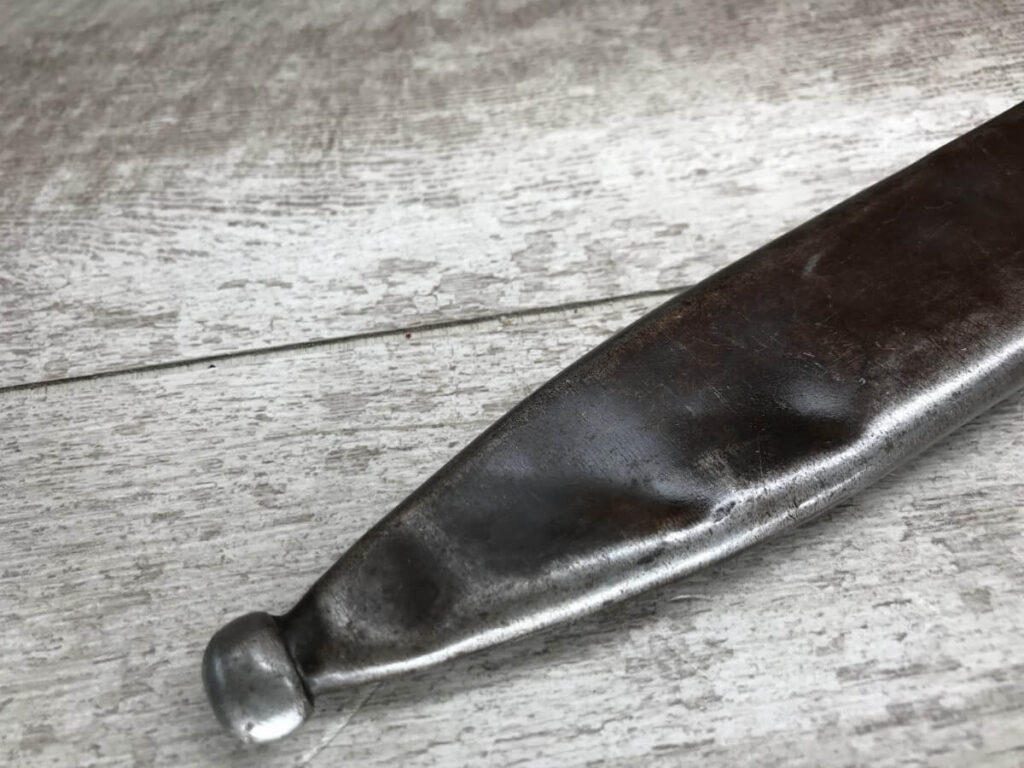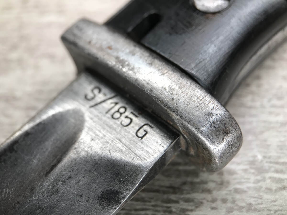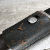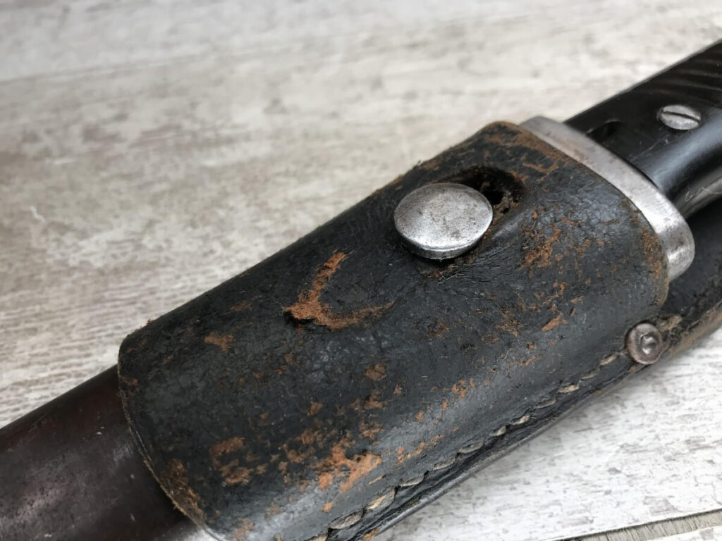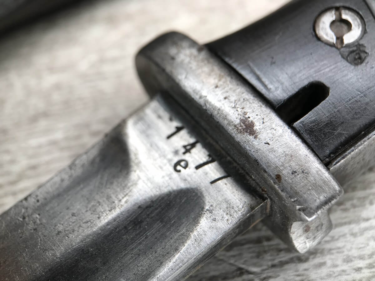 WWII GERMAN K98 BAYONET & METAL SCABBARD/FROG #1477e, 15″ OVERALL, 9 3/4″ BLADE LENGTH, BAKELITE GRIPS, SOME DINGS AND SCRATCHES, WaA218 NEAR PRESS-STUD BUTTON (BUTTON IS MISSING), VG OVERALL CONDITION, SCABBARD IS DENTED BUT BLADE INSERTS SMOOTHLY, SEE PHOTOS