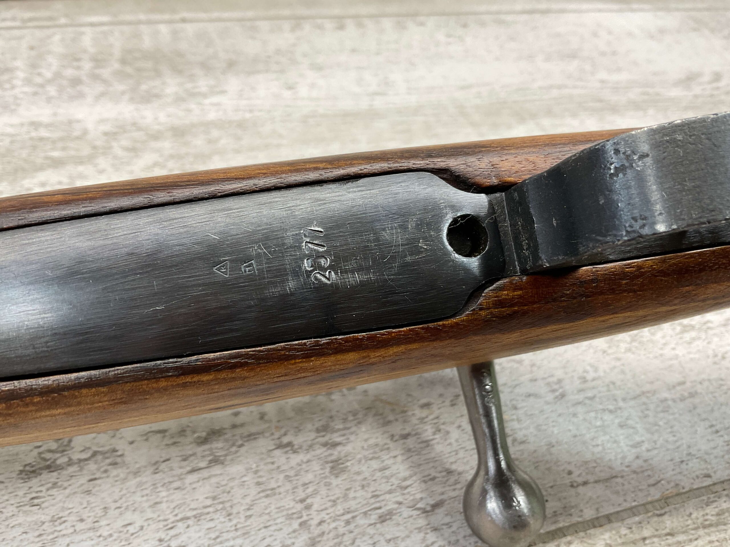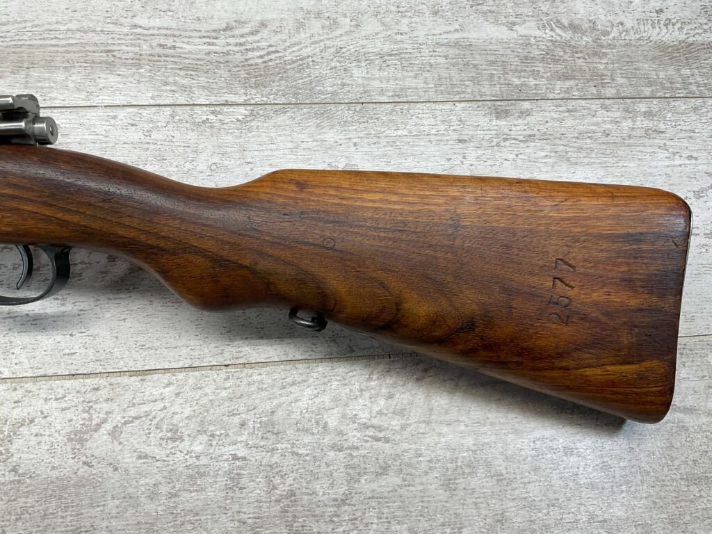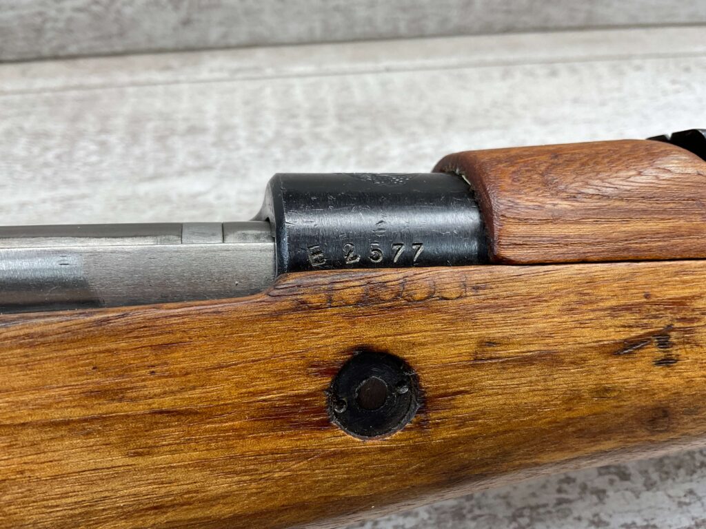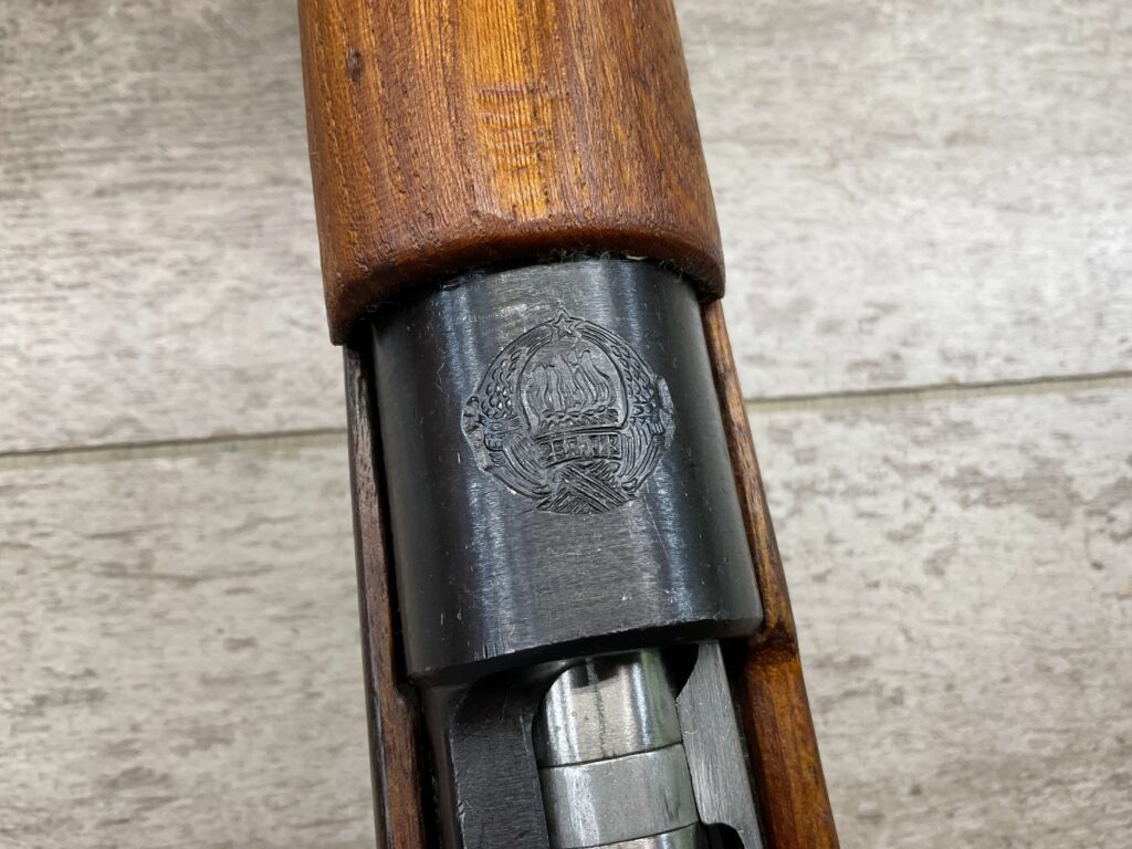 IMPORT MARK ON SIDE OF BARREL “N.I. LLC W. HURLEY, NY / YUGOSLAVIA MOD 24/47 8MM”, RIGHT SIDE OF RECEIVER MARKED “E2577”, TOP OF RECEIVER MARKED WITH FULL YUGOSLAVIAN CREST, LEFT SIDE OF RECEIVER MARKED “M24/47 / ПРЕДУЗЕЂЕ 44”, LEFT SIDE OF SIGHT MARKED WITH TRAPEZOID WITH N AND ANOTHER UNKNOWN NUMBER, MAGAZINE PLATE MARKED “2577” ALONG WITH TWO CORRECT PROOF MARKS, END OF LEFT SIDE OF STOCK MARKED “2577”.