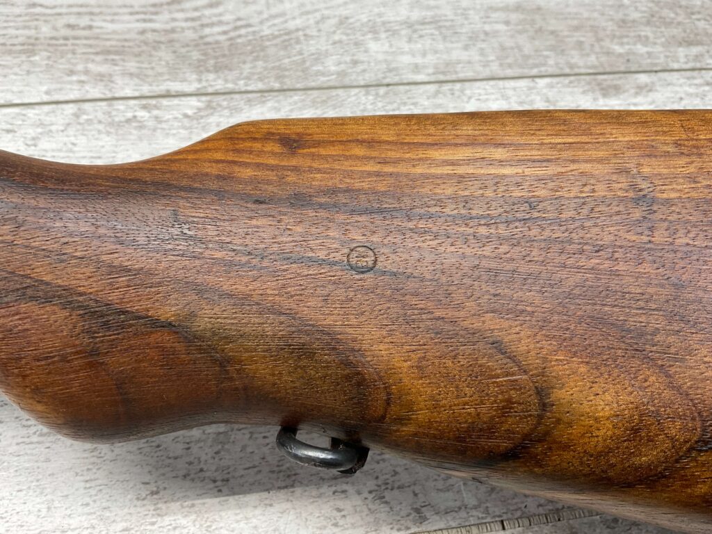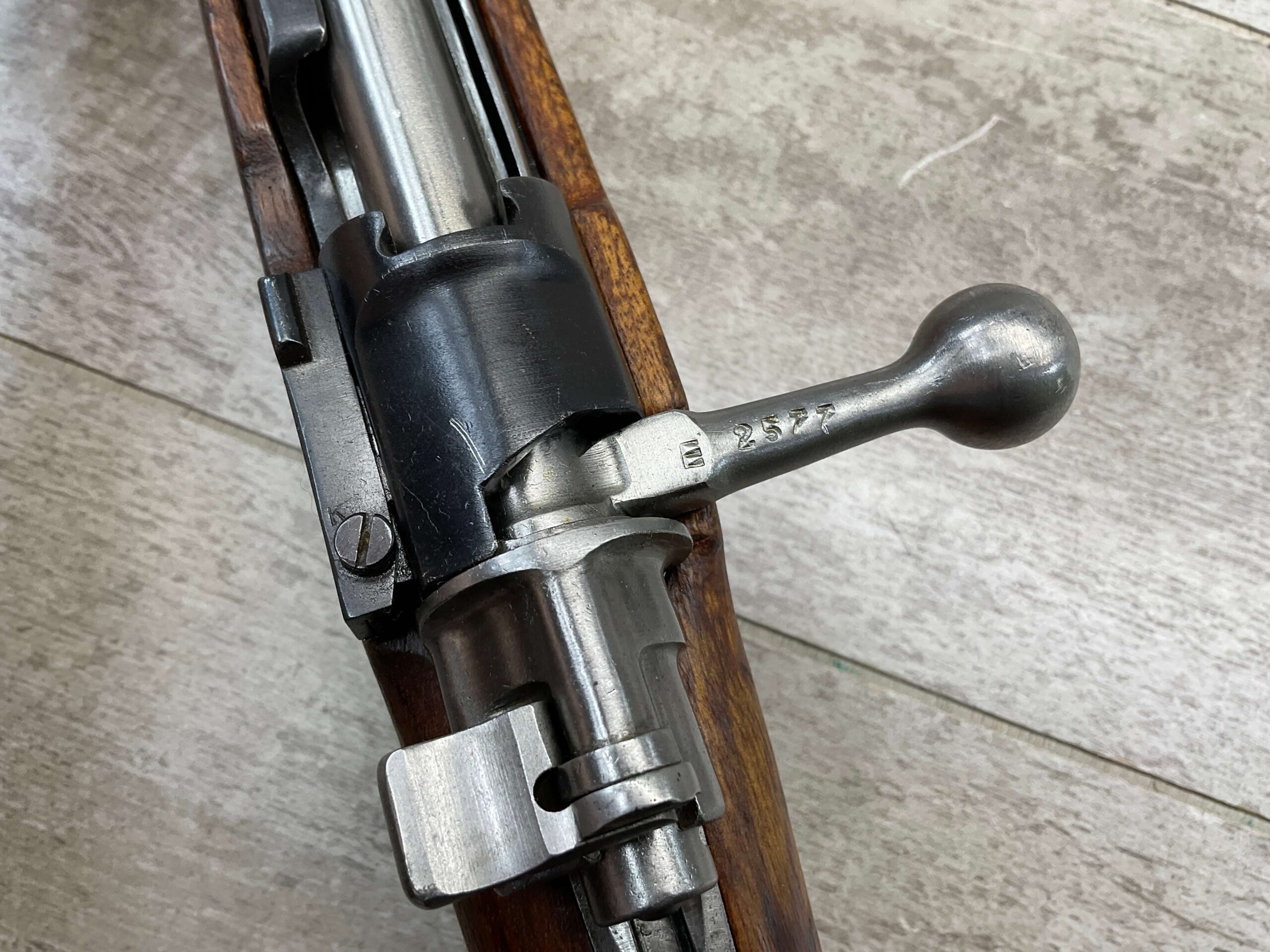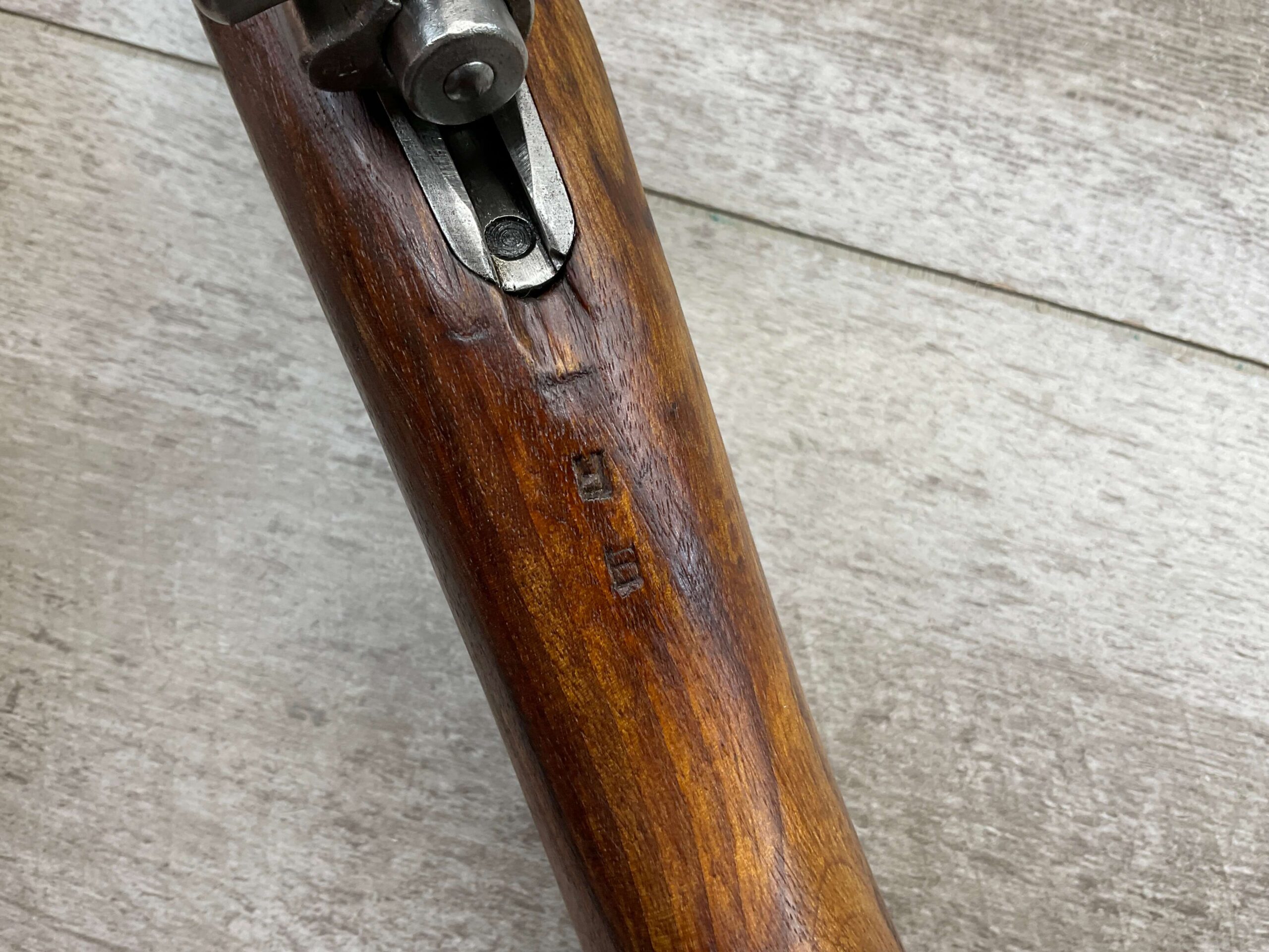 IMPORT MARK ON SIDE OF BARREL “N.I. LLC W. HURLEY, NY / YUGOSLAVIA MOD 24/47 8MM”, RIGHT SIDE OF RECEIVER MARKED “E2577”, TOP OF RECEIVER MARKED WITH FULL YUGOSLAVIAN CREST, LEFT SIDE OF RECEIVER MARKED “M24/47 / ПРЕДУЗЕЂЕ 44”, LEFT SIDE OF SIGHT MARKED WITH TRAPEZOID WITH N AND ANOTHER UNKNOWN NUMBER, MAGAZINE PLATE MARKED “2577” ALONG WITH TWO CORRECT PROOF MARKS, END OF LEFT SIDE OF STOCK MARKED “2577”.