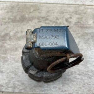 VINTAGE U.S. MILITARY M228 PINEAPPLE GRENADE INERT, TOP MARKED “FUZE M228 / MA179E / 001-004”, SIDE MARKED “RFX”.
