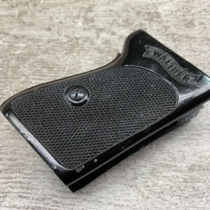 WALTHER PP BLACK PLASTIC GRIPS, INCLUDES SCREW, HARD TO FIND, VG COND W/SMALL CRACKS IN LEFT GRIP